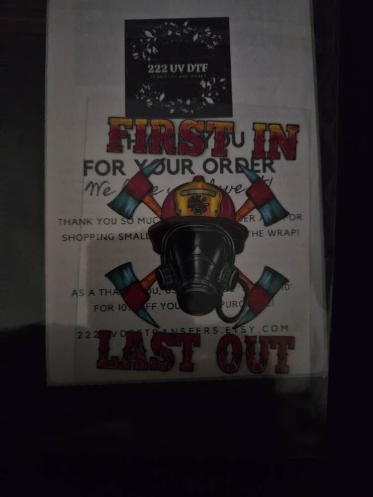 Firefighter First In, Last Out UV DTF Wrap Transfer 16oz | No Heat Needed | Waterproof | Permanent Adhesive